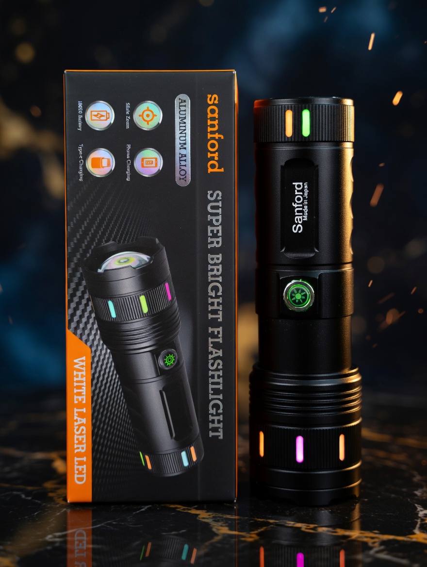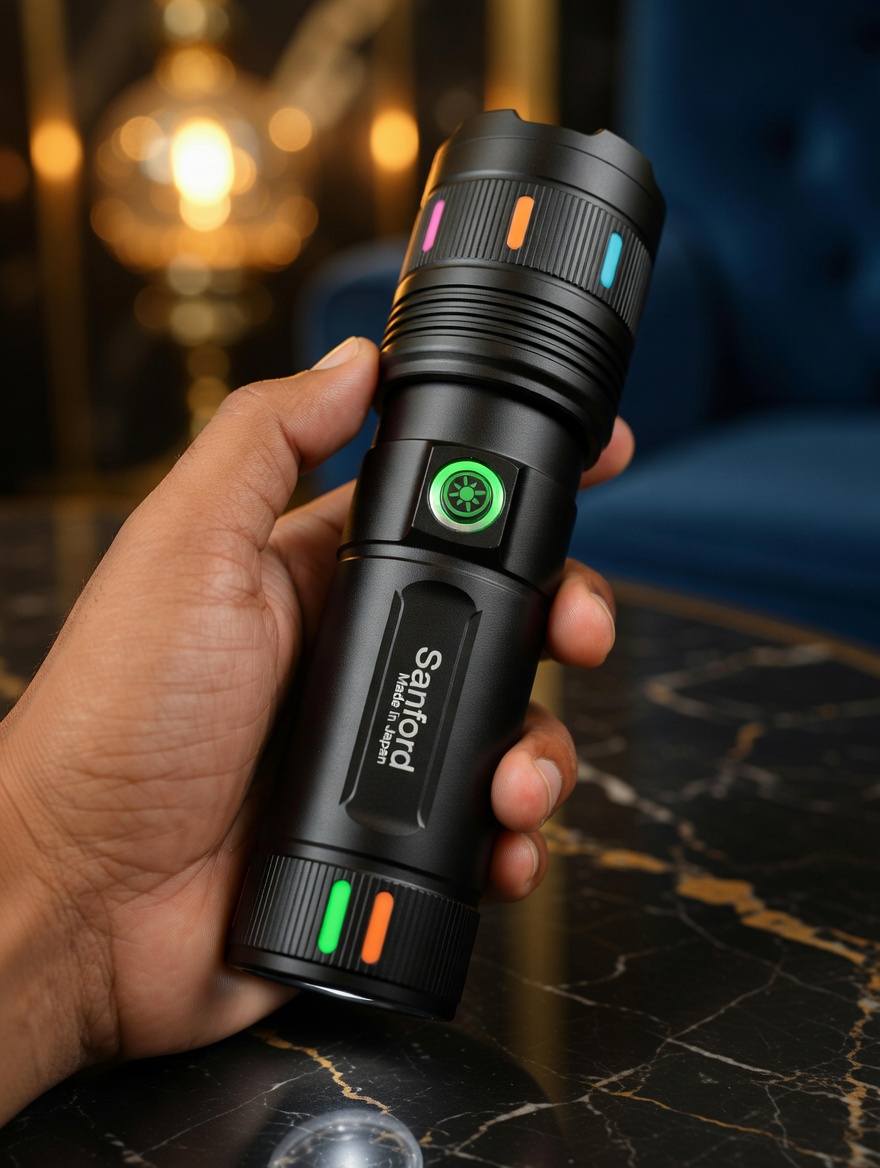 উন্নত LED চিপ ব্যবহারের ফলে টর্চটি অত্যন্ত শক্তিশালী ও উজ্জ্বল আলো প্রদান করে। লিথিয়াম ব্যাটারির কারণে দীর্ঘ সময় ব্যবহার করা যায়।